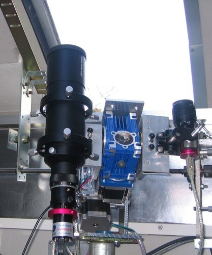 ほぼ完成した赤道儀、連続して安定に使用できるように自宅のスライディングルーフ観測室に設置した。なるべく高い位置にあるようにして、三脚は使わずに、足場などに使う単管パイプと関連の金具を使ってごらんのとおり。水平方向には回転できるので、極軸の…