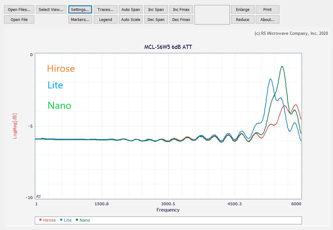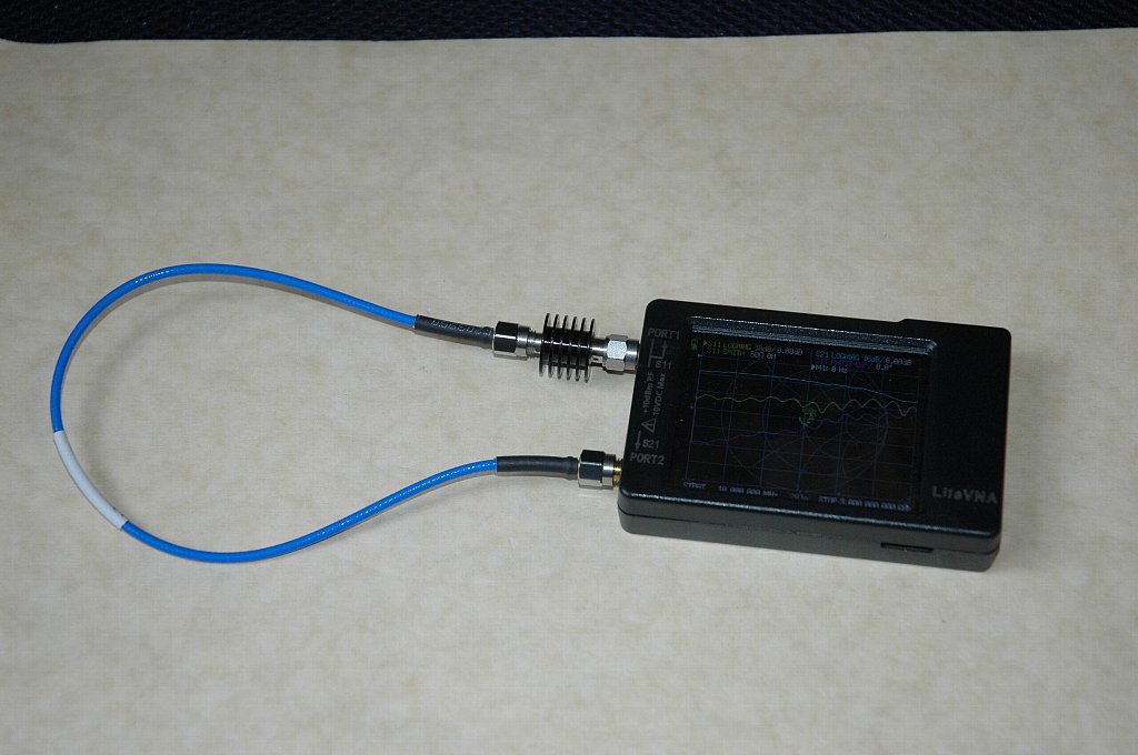 この組み合わせで Load =50 Ω を変えて LiteVNA のキャリブレーションを行い、同じ DUT を測定する。DUT には手持ちの Mini Circuits のアッテネーター BW-S6W5 (6dB DC~18GHz)を使う。