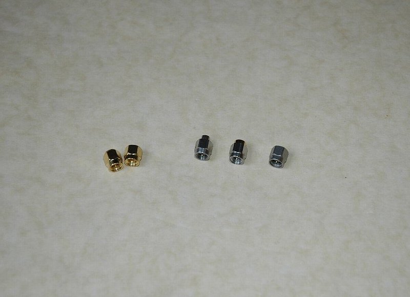 そこで、手持ちのキャブレーション KIT を使って比較測定をしてみた。写真は キャリブレーション KIT で 左の2個が LiteVNA 付属の SHORT、OPEN 。右の3個は 50Ω LOAD 、左から ヒロセ HRM-601A ( DC-18 GHz )、右二つはそれぞれ、LiteVNA、Nano の付属のもの。