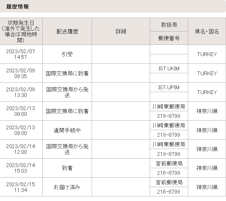 この機種は大人気で過去には 500個を15分くらいの間に売り切れたということもあったとのこと。 発注した時点では、2月末の発送になるよ、ということだったのだが先日いきなり発送の連絡がきて、それから1週間ほどで到着。発送連絡メールをたどって見た QRP Labs の掲示板の書き込みによると基板を1000 個製作発注していたのだが、到着前に 200 個余り在庫が見つかったとのこと。今見ると製作依頼していた基板も届いたのか、在庫は 1000 個余りとなっている。送料の安い エアーメールを選択、なぜか発送はトルコから、気になった地震の影響もなく到着。