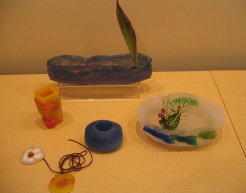 ガラスの仕上げがいまいちな所を目立たなくするために、花を活けたら、講師の先生が花を見せる展示会ではなく、ガラス工芸を見せる会なんだ、と言ってシンプルなものに変更した。たしかにその通り。